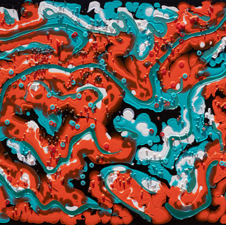 As my blog readers know by now, I have been abstracting from my many experiences and studies in life; i.e. making “abstracted” paintings and drawings. Having not anticipated this recent turn of events, I have surprised myself by delving into a biological, under-the-microscope, medical kind of abstracted imagery. After the operation, as I got back to my studio, I was so elated at being alive, having dodged a bullet so to speak, I started this new series; “So Elated to Be Starting the Fourth of My Nine Lives”. The first three lives are another set of stories and I will spare my readers those gory (although funny in a black sort of way) details for now. Anyway, I have started with head diagrams of the melanoma cells in my scalp, and then just progressed into an overall biological abstraction, perhaps emphasizing my joy at being alive and being able to freely create works in my studio. Hence all the glitter glue, and at times, including a new find for me; colored “heishi”, discovered in the jewelry section of arts and crafts stores, that are used to make bead necklaces. I find myself recalling how much my mother liked to collect and wear Pueblo jewelry. I made sure I bought some turquoise colored heishi beads that are made from clay. As single pieces dropped into wet paint, they appear as small discs with center holes.